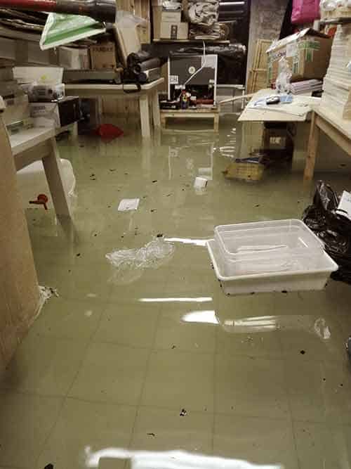 The water level exceeds the shop window and comes dangerously close to the edge of the bulkhead. The water comes from the floor.