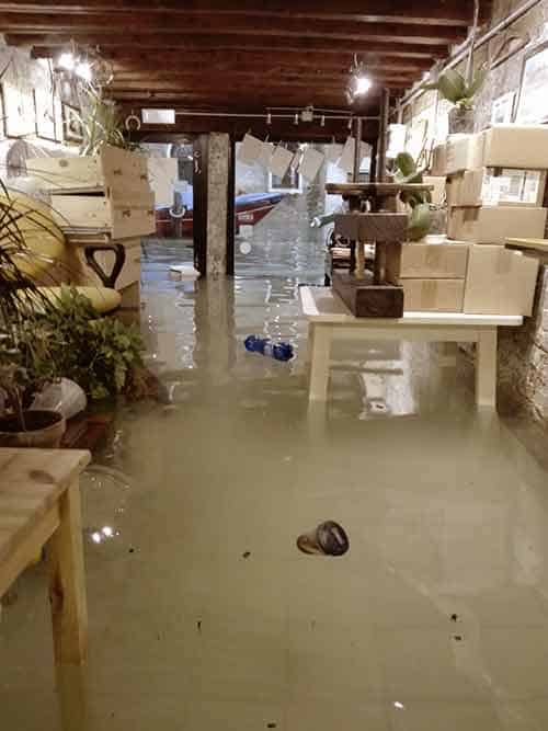At this point it’s really too close, the sirocco wind continues to blow and it’s a moment: the water passes the bulkhead, enters the studio and invades everything. The bulkhead is no longer needed, the pump is no longer needed: there is no longer any difference between inside and outside. Things at a lower level begin to float and go around the store.