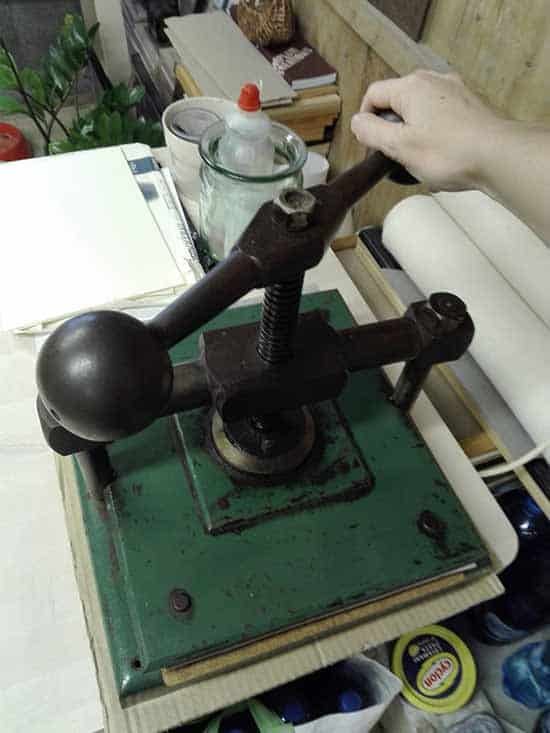 Ho posizionato il foglio su una tavoletta di legno, che funge da piano del mio torchio, e sopra di esso la lastra di gomma inchiostrata. Una tavoletta uguale a quella inferiore viene messa sopra alla lastra, ed infine un foglio di gomma morbida, per ammortizzare la pressione del torchio.