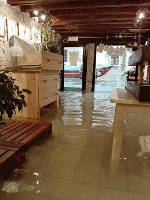 A questo punto siamo davvero troppo vicino, il vento di scirocco continua a soffiare ed è un attimo: l’acqua passa la paratia, entra in studio e invade tutto. La paratia non serve più, la pompa non serve più: non c’è più differenza tra interno ed esterno. Le cose a un livello inferiore iniziano a galleggiare e girano per il negozio.