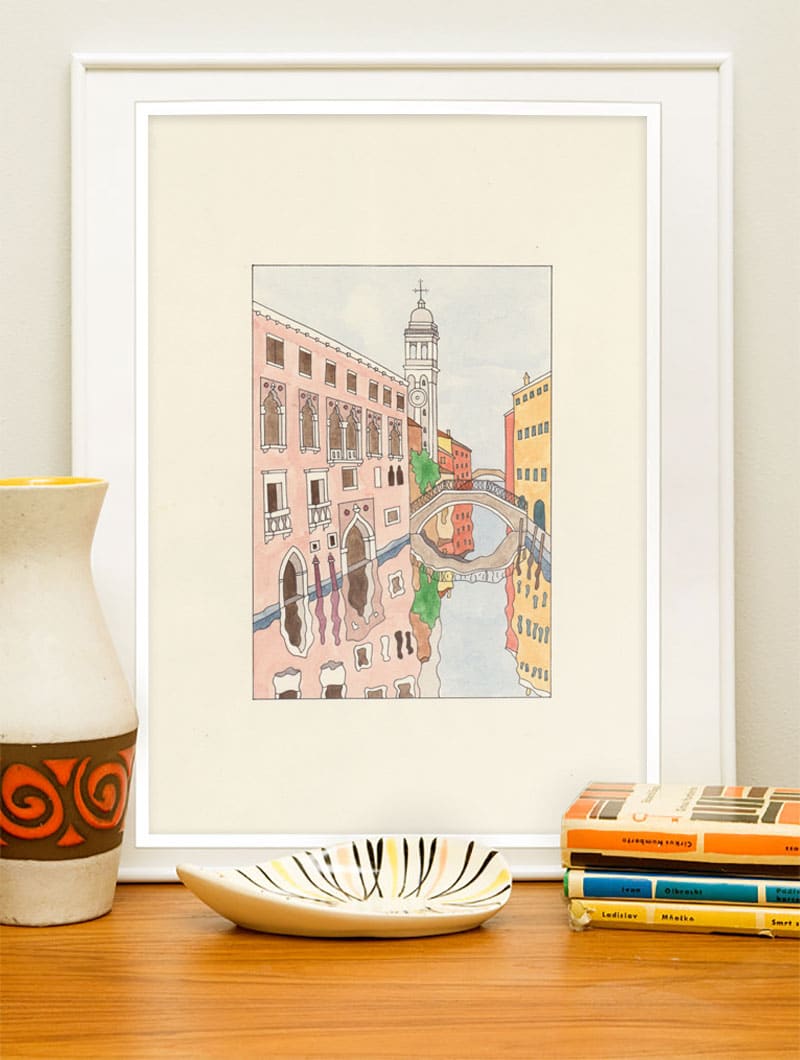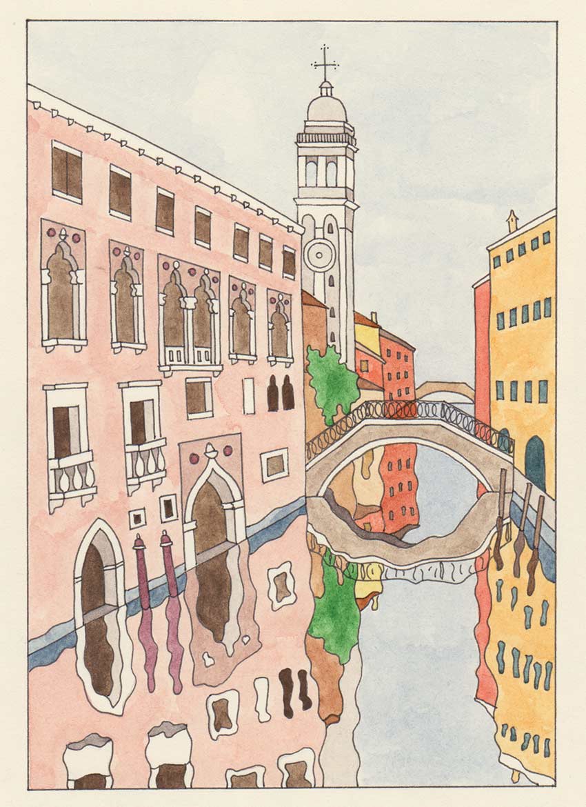 Campanile di San Giorgio dei Greci è un disegno a penna originale colorato con acquerello su carta avorio Favini acid-free 200 gr