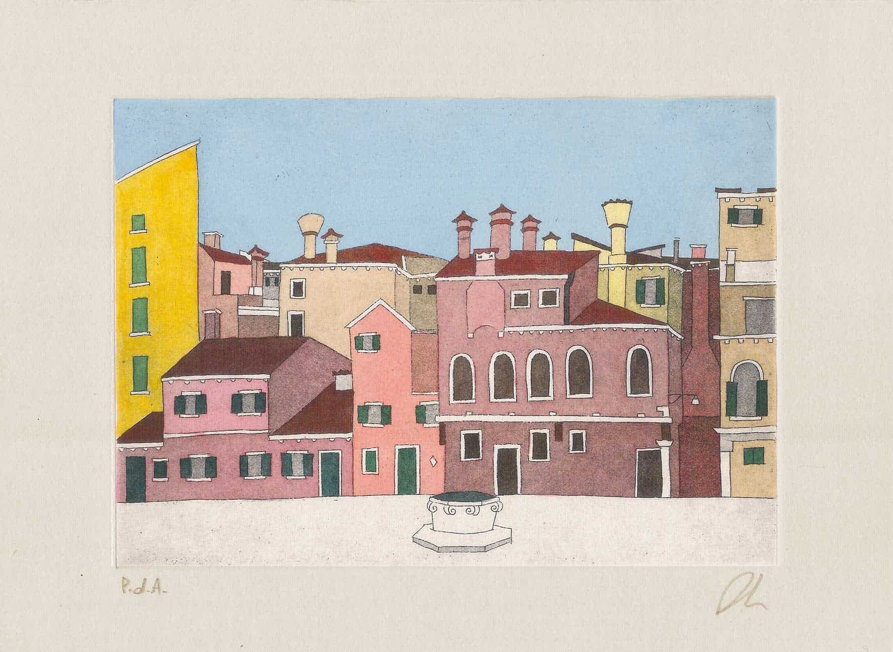 La calcografia è stata poi colorata a mano con la tecnica dell’acquerello. La sigla P.d.A. in basso a sinistra, al posto del numero di serie, significa Prova d’Artista (P.d.A. “Prova d’Artista”).