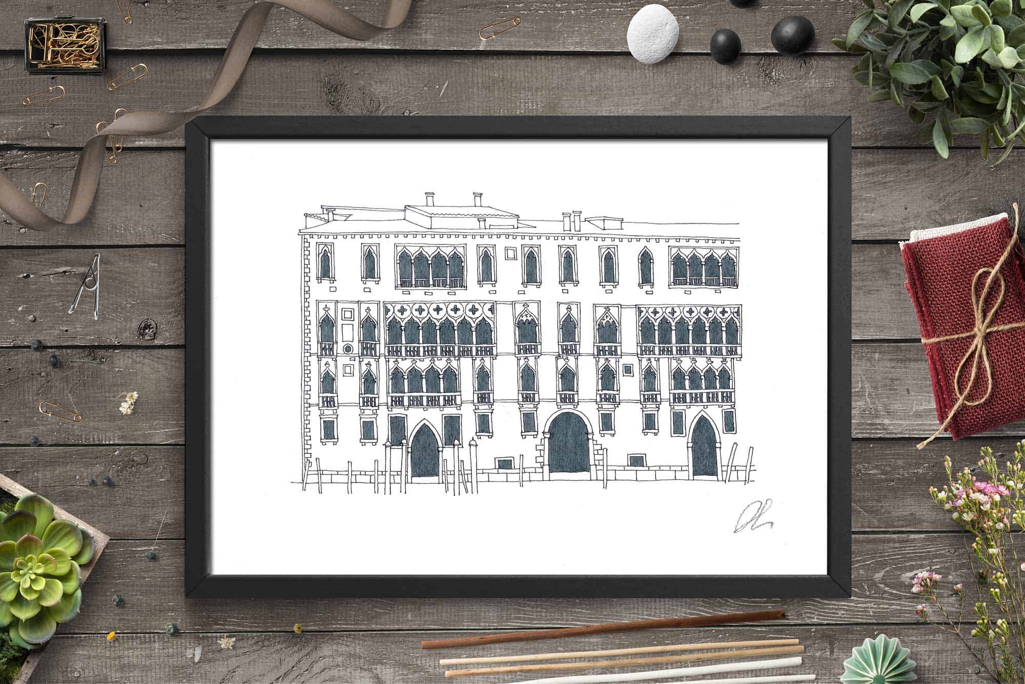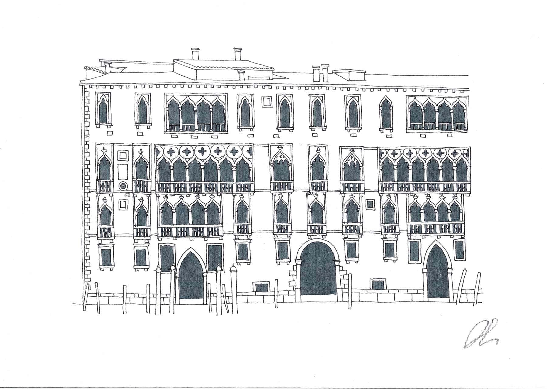 Disegno a pennarello indelebile fino su carta Fabriano a grana fine con 50% di cotone senza acidi che garantisce l’inalterabilità nel tempo.
