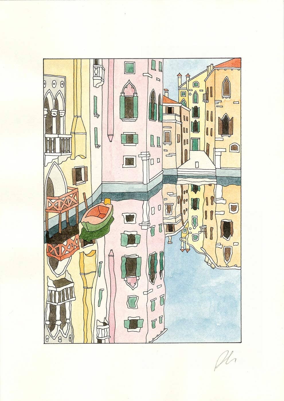 In questo acquarello si può vedere il Rio del Fontego dei Tedeschi, come si vede da Ponte de l’Ogio (“ponte dell’olio” in veneziano). Il canale prende il nome dal Fontego dei Tedeschi: infatti un lato di questo meraviglioso edificio si affaccia sul canale.