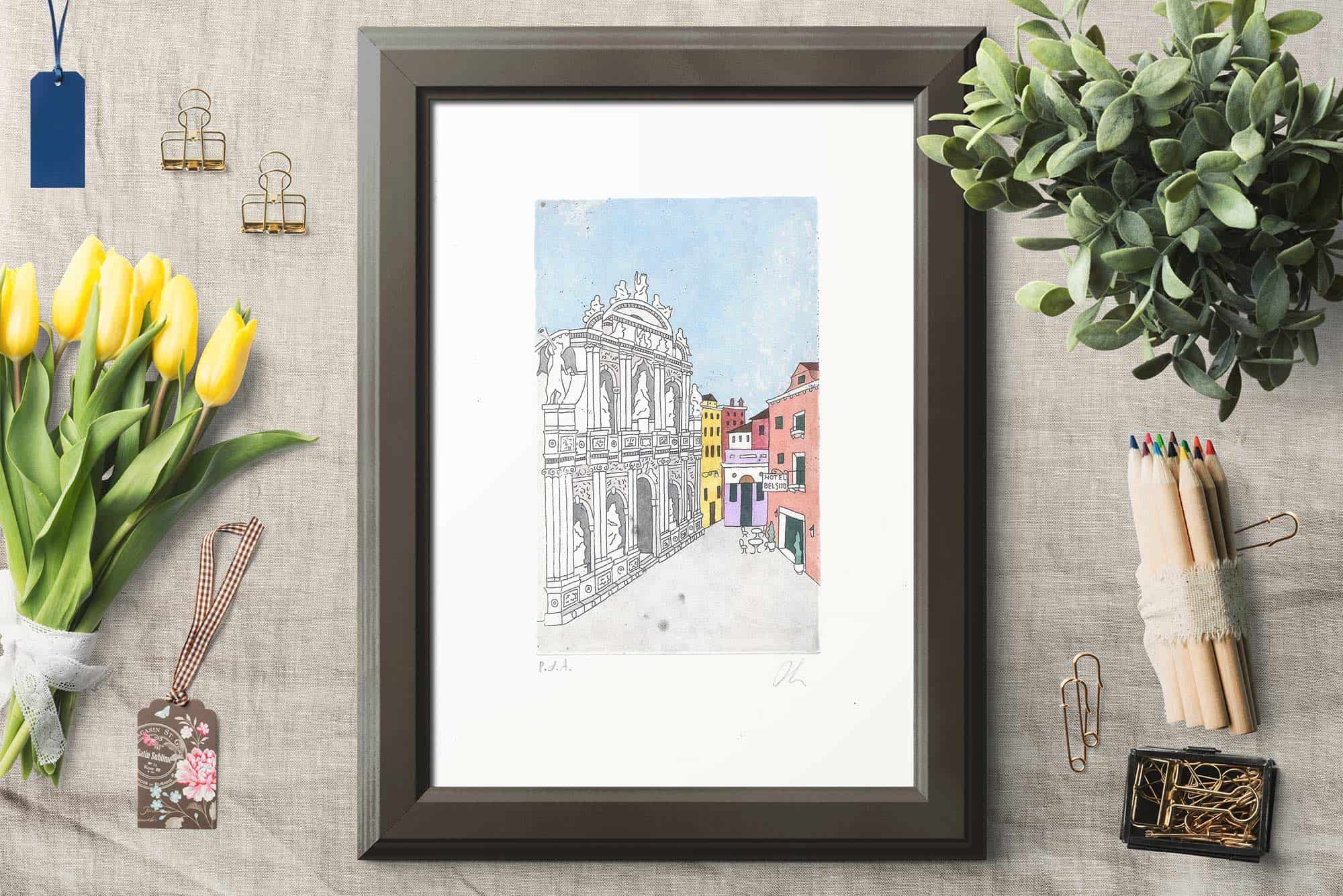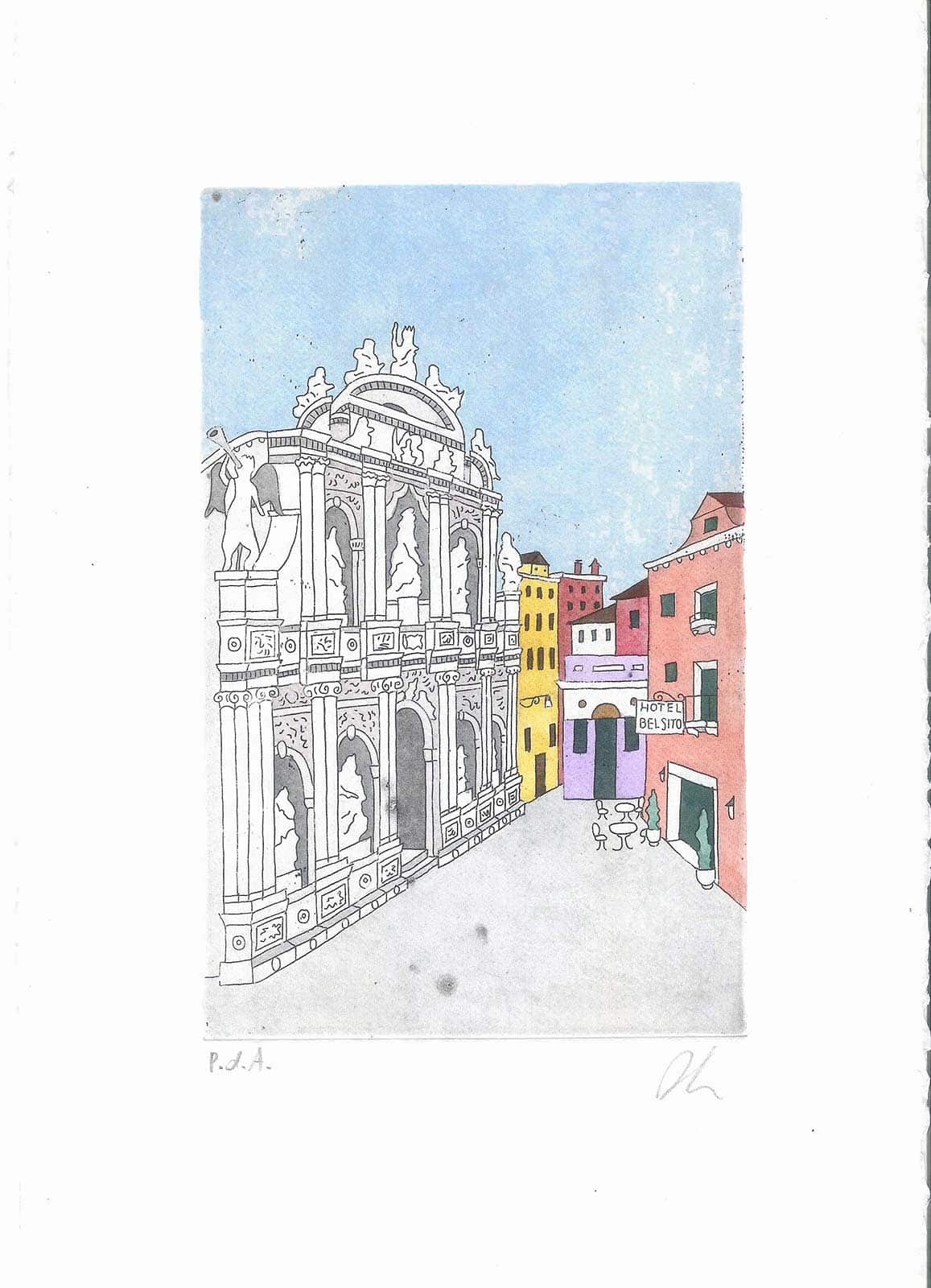 Stampata su lastra di zinco con inchiostro calcografico (tecniche usate: acquaforte e acquatinta) su carta rosaspina bianca. La calcografia è stata poi colorata a mano con la tecnica dell’acquerello. La sigla P.d.A. in basso a sinistra, al posto del numero di serie, significa Prova d’Artista (P.d.A. “Prova d’Artista”).