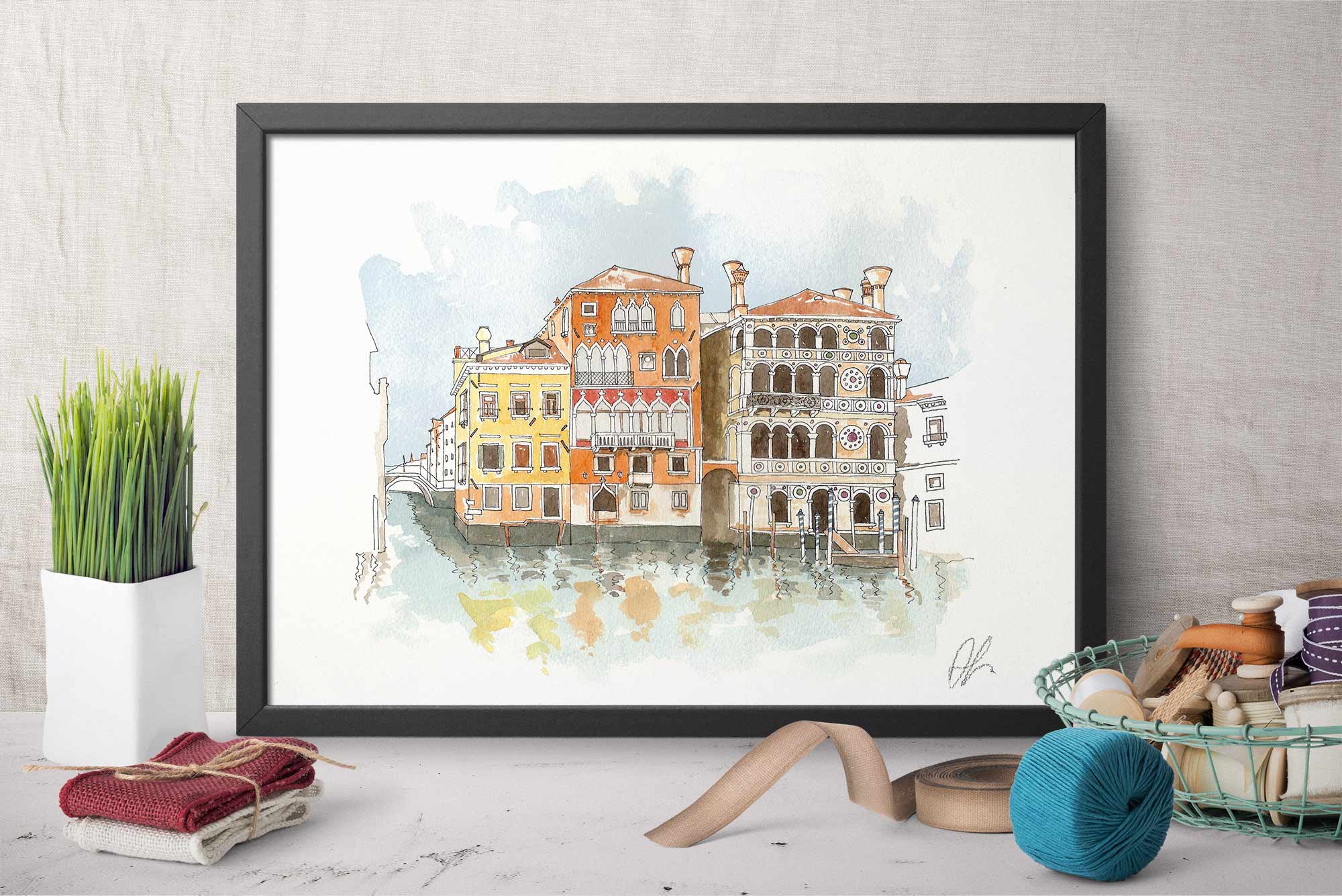 This reproduction shows three of the main palaces facing the Grand Canal in Venice, in the Dorsoduro district.