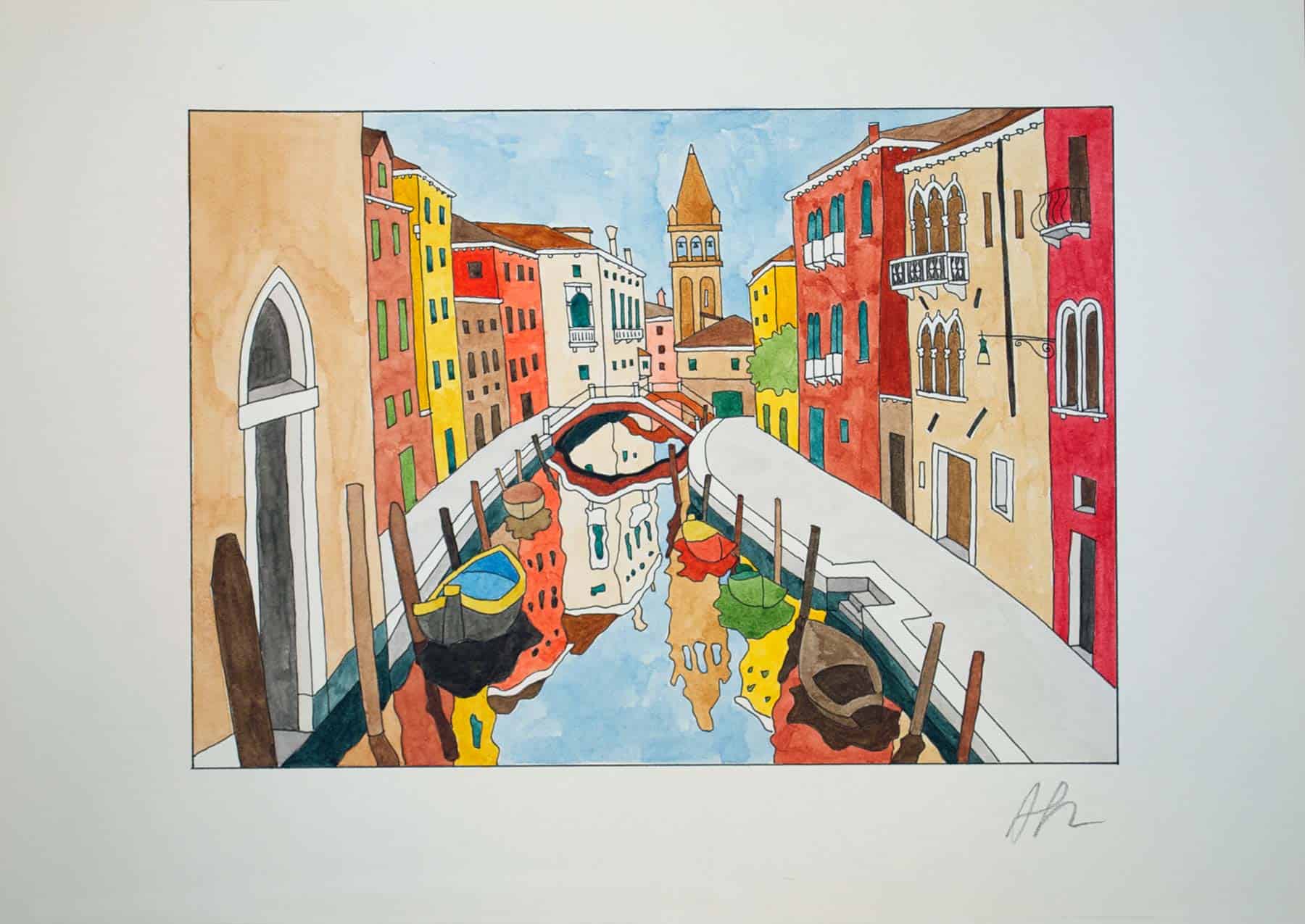 Technique used: thin black felt pen drawing colored with watercolors on 200 gr. Rismacqua Favini ivory paper
