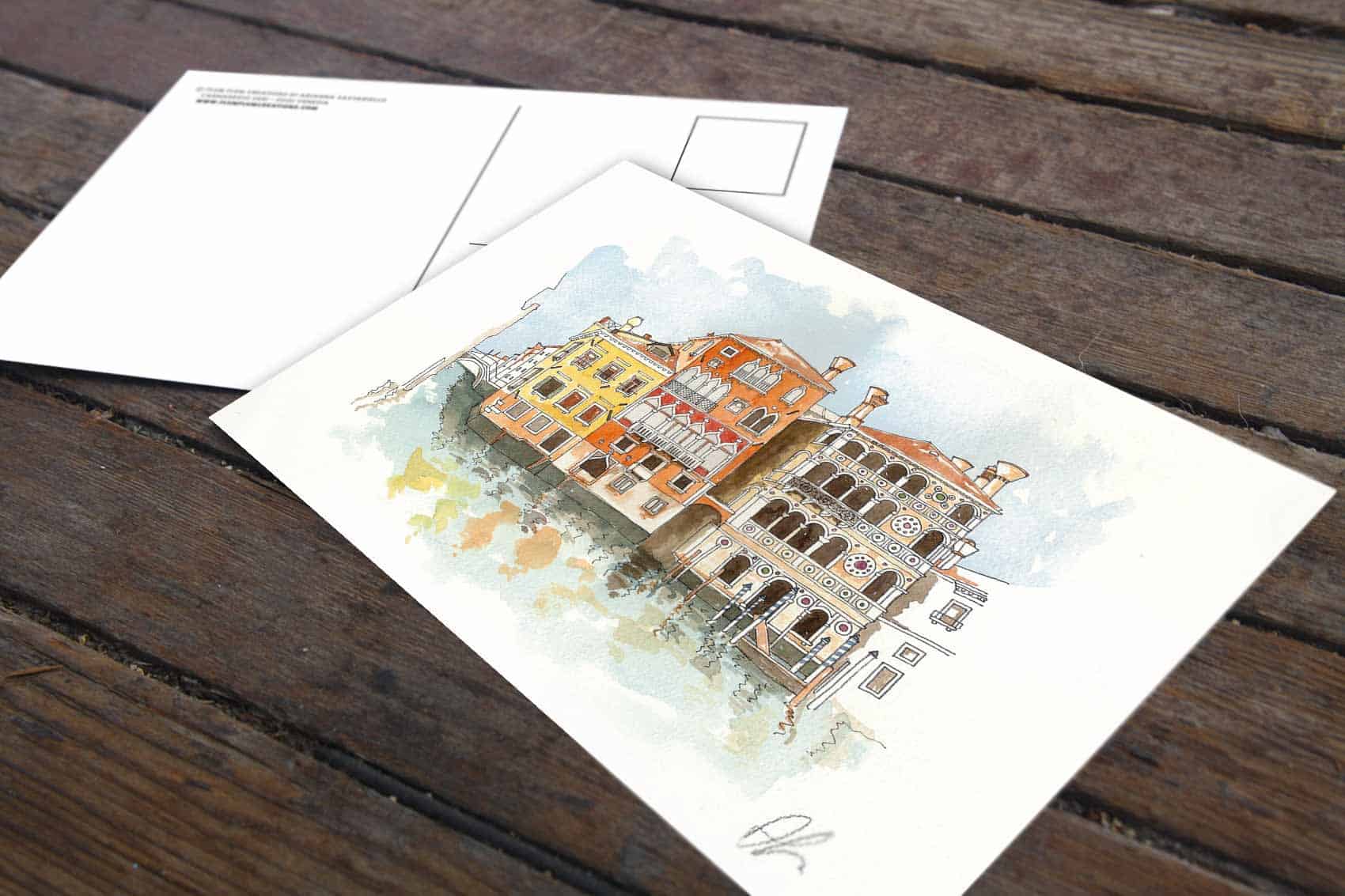 This postcard shows three of the main palaces facing the Grand Canal in Venice, in the Dorsoduro district.