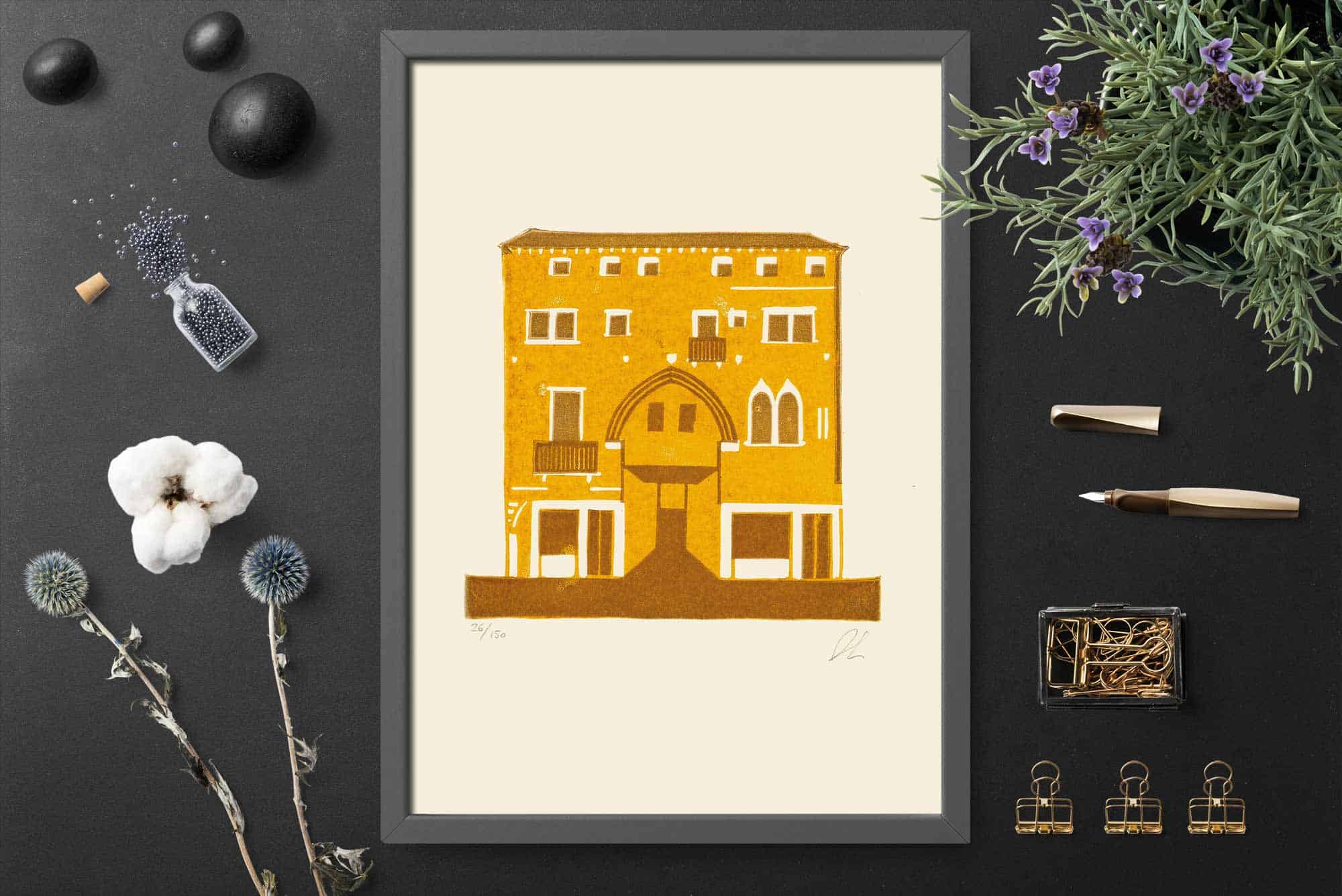 Print handmade in my studio in the historic center of Venice, Italy with a vertical press.