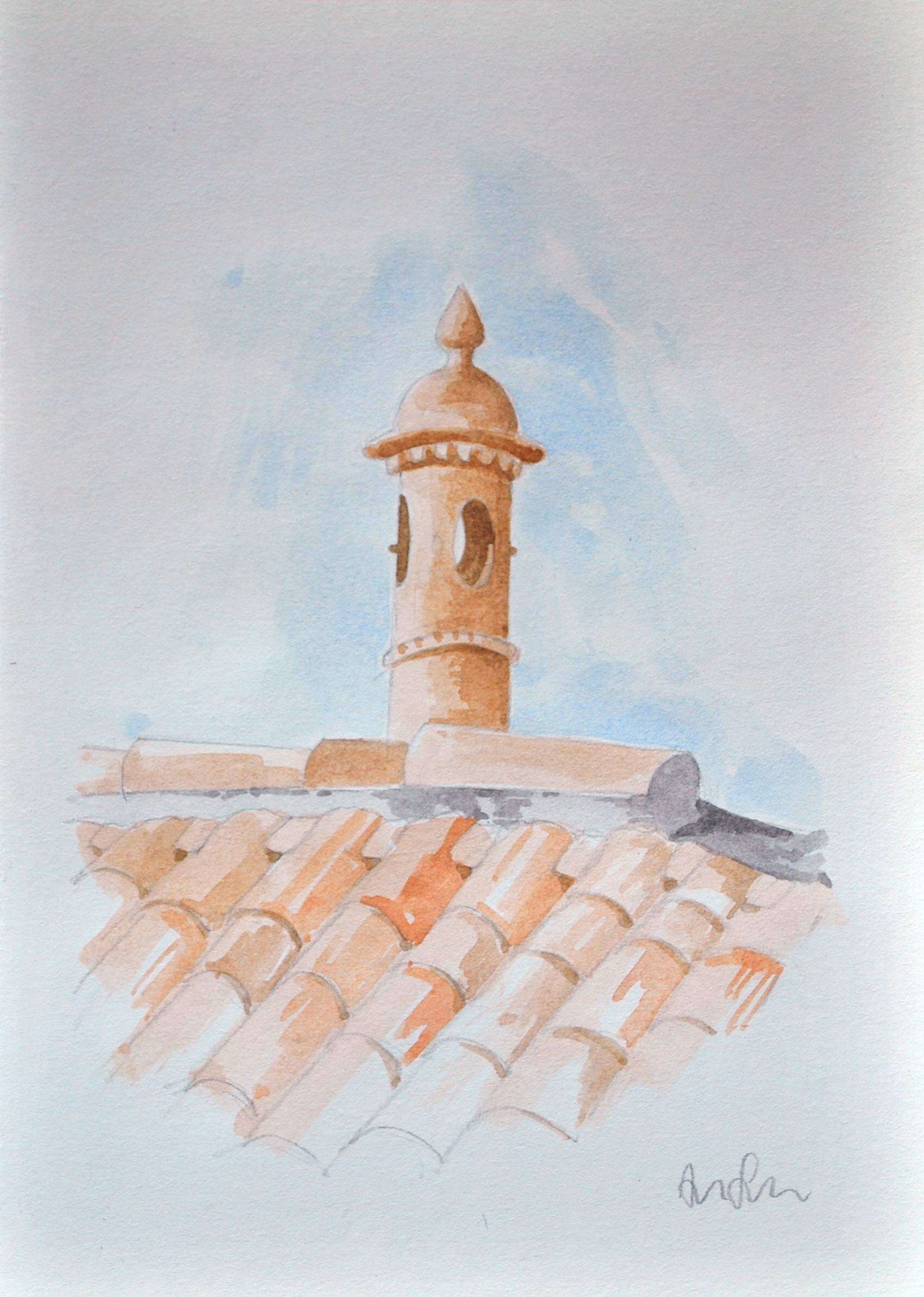 Still life drawing of a chimney I see from the window of my house. I left the drawing with the pencil and then I colored with slight watercolor brushstrokes.
