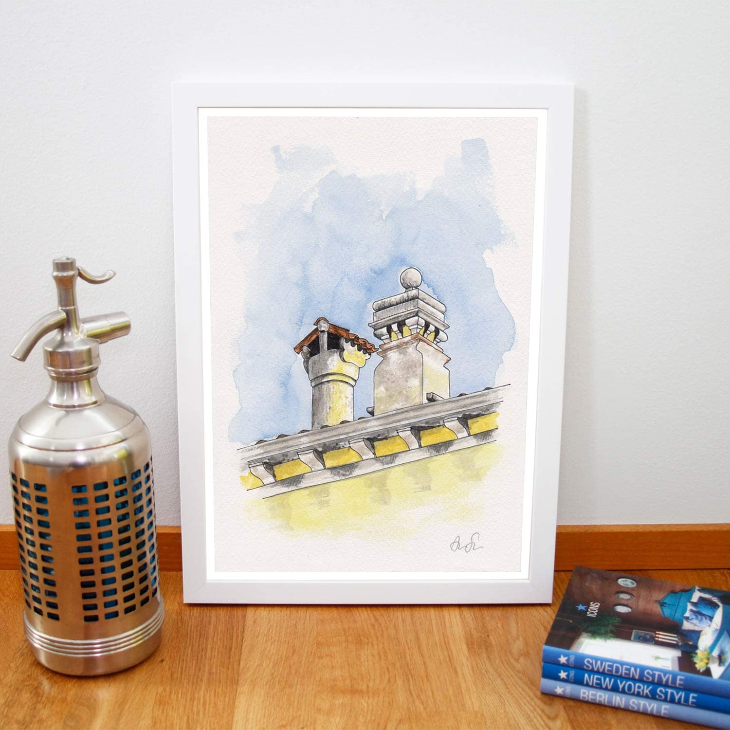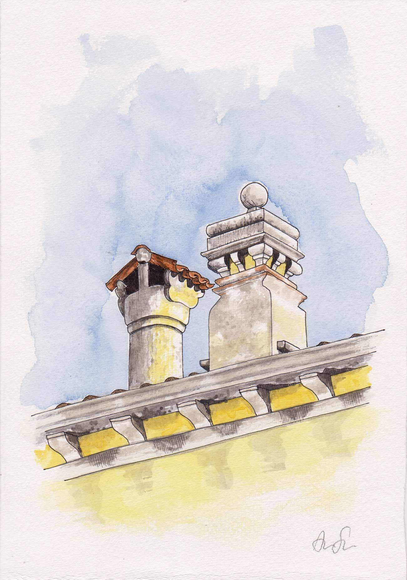 Original watercolor of a venetian chimney (Venetian Chimney 11) made on 300 gr white 50% cotton watercolor paper.