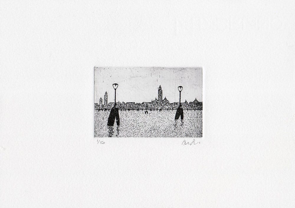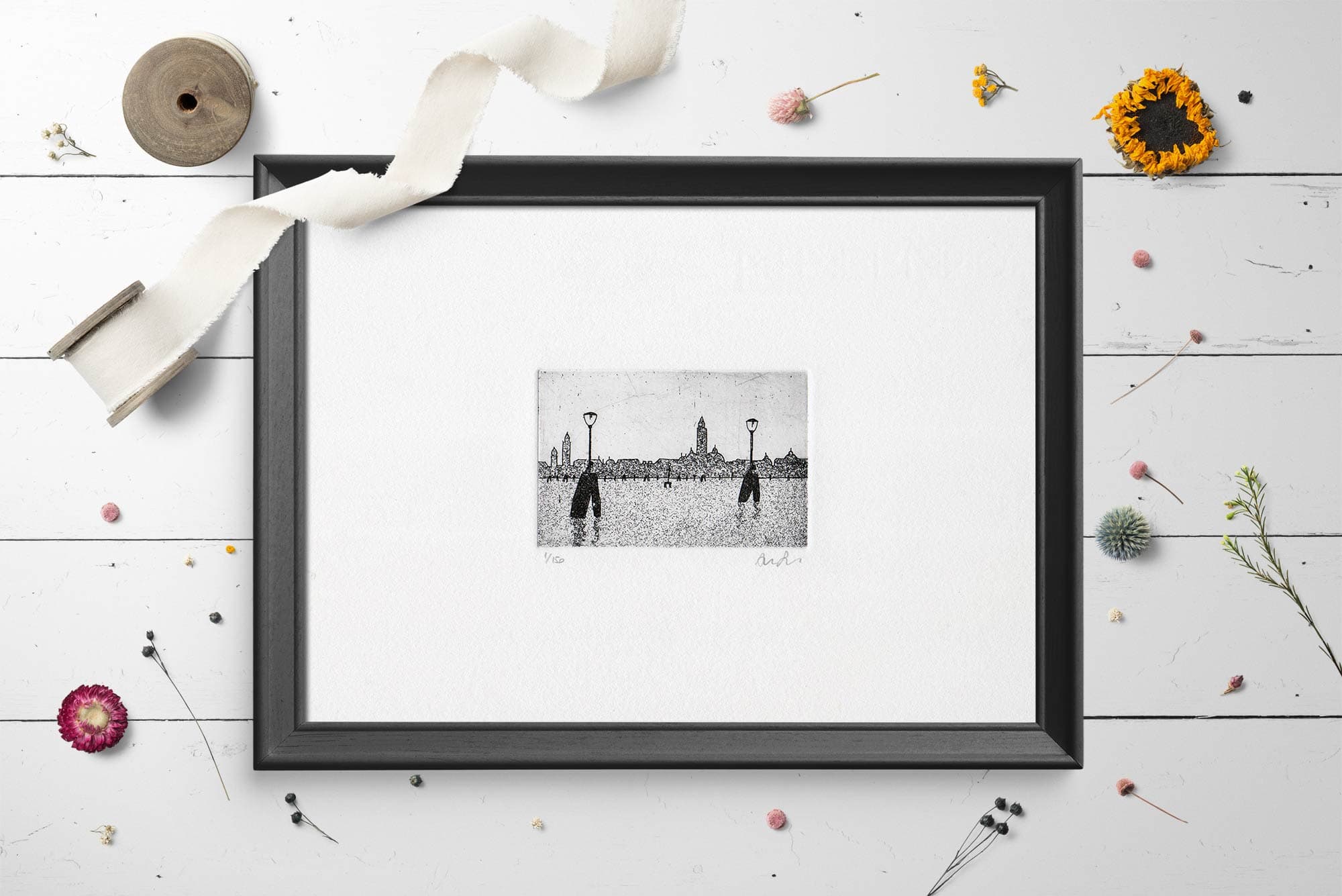 A copperplate etching representing the Venice skyline. This is the view of Venice as you can see it from the Northern Lagoon, on the way to Murano.